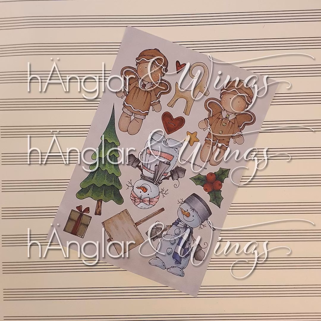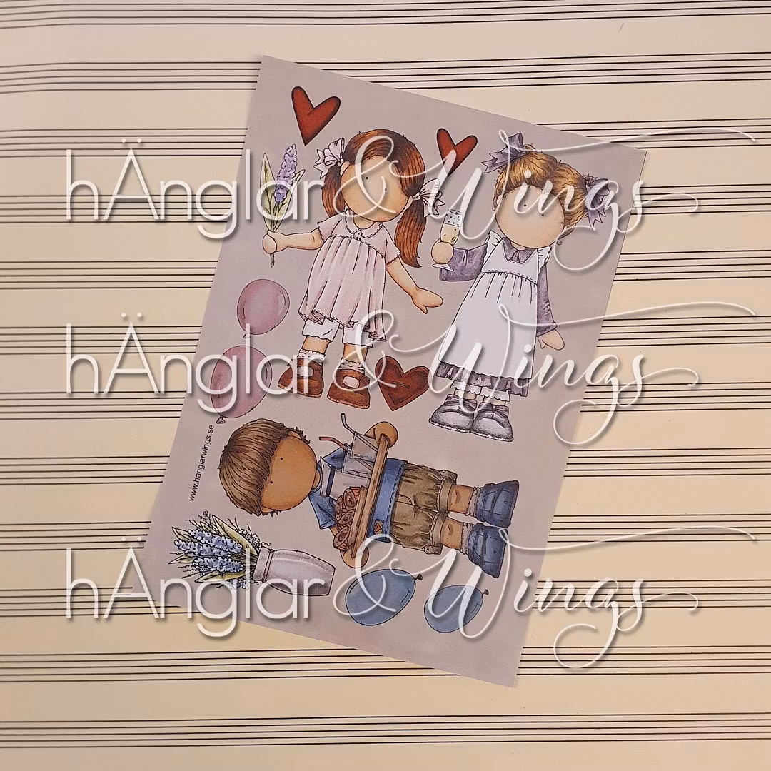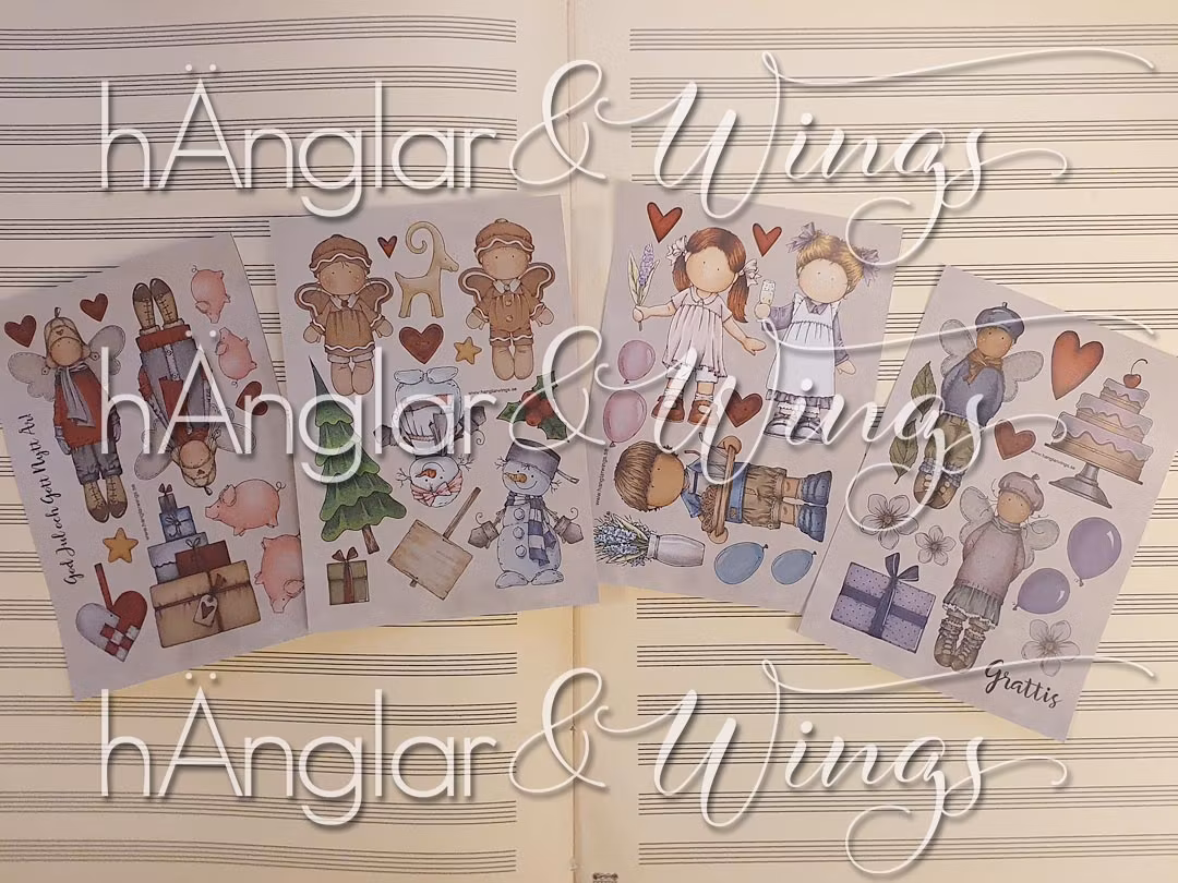 Bakgrunden är lätt beige-tonad (ej vit) och du klipper själv ur figurerna för att skapa kort eller andra alster.